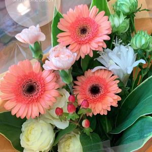かわいいブーケいただきました💐 私の大好きなオレンジ系の色合い🧡 サーモンピンクのガーベラが素敵です
