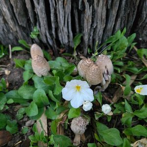 ササクレヒトヨタケ🍄 毎年、同じ場所にでます 白い花はギンパイソウ