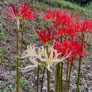 ヒガンバナ 昨日アップした時は、 白?かな?まだ咲いていませんでした。 今日😊咲きました 赤も昨日より濃くなってる😃 紅白で縁起が良いかも😃