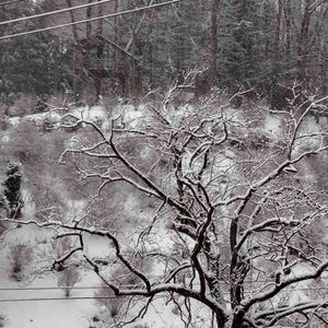 久々のお向かいの花山🌳 我が家の2階からパチリ 手前は柿の木、我が家のです 雪が降り白黒の世界もなかなかいい😃