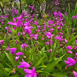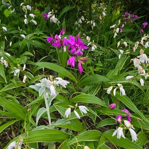 シラン 白もあります、葉っぱが斑入りでかわいーよ 紫のシランとラムズイヤーがお邪魔してます😅