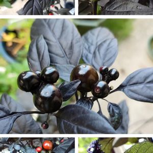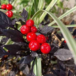 トウガラシブラックパール⚫ 投稿し直しました🙇 長く楽しませてくれる優等生👨🎓 紫色🟣の花 緑🟢のタヒチアンパール 黒い⚫ブラックパール 赤い🔴珊瑚 黒い葉っぱも綺麗 投稿した後 ピントが気になって 撮り直してきました 最初にイイネ下さった方 ごめんなさいm(_ _)m