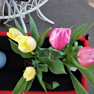お散歩途中(近くのホームセンター)。 綺麗に飾った鉢に、「チューリップ」が綺麗に咲いていました。 パチリ