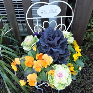 お散歩途中。 綺麗な「ハボタン(葉牡丹)」と「ビオラ」の寄せ植え、強く惹かれるものがありました。 パチリ よく見ると「群青色」の葉牡丹が異彩なのかな・・・😺