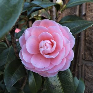 朝の通勤途中。 葉陰に隠れて綺麗なお花「オトメツバキ(乙女椿)」が咲いていました。 パチリ