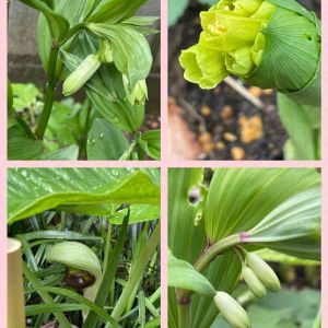 我が家の庭 ↖️ホウチャクソウ(イヌサフラン科チゴユリ属) ↗️キバナホウチャクソウ(イヌサフラン科チゴユリ属) ↙️ムサシアブミ(サトイモ科テンナンショウ属) ↘️アマドコロ(キジカクシ科アマドコロ属) 4、5日いなかった間 気温が高かった事もあり庭の花がかいっせいに開いていました 雑草も凄い勢いで出てます 昨日からせっせと抜いています