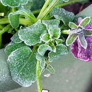 おはようございます😊 1月12日(木)☀️.°15℃朝は霜で真っ白🥶 朝お花達🧊🪰🌼*・🪰 霜で凍ってイタッ(°д०॥)✷✸🤳 15℃迄気温が…寒暖差気をつけて元気で お過ごしください🍀*゜