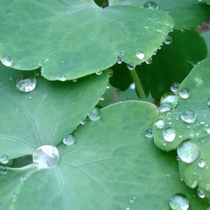 今朝の束の間雨で 💧が残る花達✨🌿🩷💚 ①苧環の葉 ②八重咲き立葵 ③黒法師 ④吹雪の松 ⑤プラティフィラ 小さな子苗が盛々に😍