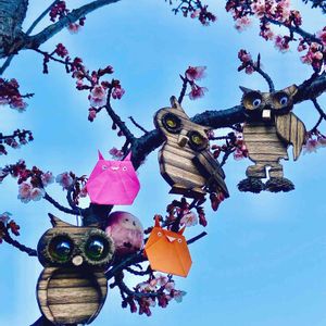 カンザクラに集まるフクロウさん 別名サトザクラ 花言葉「気まぐれ」「あなたに微笑む」 🏷フクロウ祭り 参加させて頂きます クイズです 寒桜に集まっている🦉ちゃん何羽いるでしょうか? すべて手作りしました