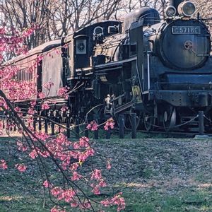 公園の展示のデゴイチの前の寒桜ちょっと素敵🌸