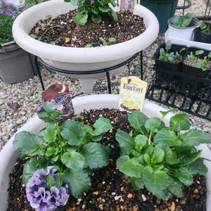 ♡ビオラ エッグタルト🥚♡ いつもの園芸店の初売りでエッグタルト🥚入りの寄せ植えセットが半額に🙌🙌 昨年からずっと欲しかったサトウ園芸さんのエッグタルト🥚が2ポットに斑入りスーパーアリッサム1ポットに鉢がセットになって福袋になってました😆 斑入りアリッサムもお花はまだこれからですが 葉っぱ🍃だけでも充分楽しめもす。 バランスを考えて奧のユリオプスデージー🌼を加えて鉢に苗ポットごと置いてみました🤭 また改めて寄せ植えしようと思います。
