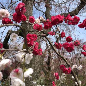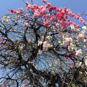 4/7(火)③ 源平咲き枝垂れ桃 この源平咲きは一本の木に紅白やピンク、絞りの花が咲きます。 この木は白多めで、ピンクが少し。絞りも少し。紅はありませんでした。 奥は前picの枝垂れ桜です🤗🎵