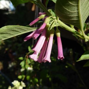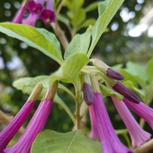 ミニエンジェルトランペット イオクロマキアネウム 大きなエンジェルトランペットは植え場所に困ると小型品種があったので昨年から育ててます〜冬に枯れたかと思ってたら復活して花が咲きました💜
