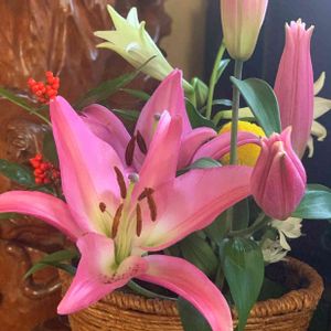 お正月用に買った百合の花。 ドッカーンと大きな花が開きました❣️ 花入れの長さに合わせずに茎を切ってしまったのでバランス悪いけど😭 大きく開いた花に元気をもらいました❤️💕🥰 2020.1.3