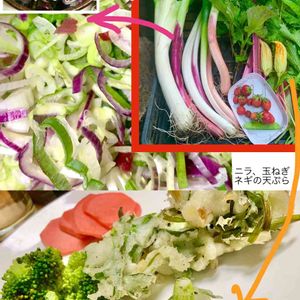 ☆赤ひげネギ、ただ切っただけでカラフル🎵 ❤🤍💚 ☆ズッキーニ ♂花が2個だったので受粉出来ないので天ぷらに トロッと美味しかったですよ〜😋 今日も♂花だけ1個咲いていました。 明日咲く♀花があったので♂花を畑作業終わったら摘んで袋入れて冷蔵庫に保存して明朝受粉しようと思ってました。 しかし摘んでくるの忘れました・・😅