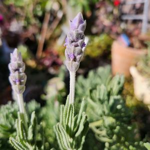 暖かくなり 一気に固い蕾から シソ科ラベンダーの紫の花が見えた 冬でも緑豊かでありがたい 一枝飾るだけでもいい香り ハーブ類は丈夫で手間なしの おすすめの花です 《15日🌤️最高20℃最低4℃》
