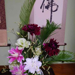 おはようございます☁ 今回初めて育てた、オリエンタルリリーを生けました🎵 ソテツも我が家の物を使用しました。 真ん中のソテツは、あえて変形した物を使用しました。