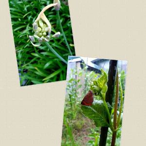 雨☔の中─ 庭パトロールすると アガパンサスが少し開き、 ダリアに、ダリかいるぞ‼️(▼∀▼) ベニシジミが雨宿り中💧