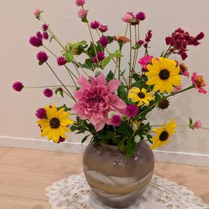もう何日もどんよりスッキリしない日が続いてます😥🙄 そんな日は、気持ちも⤵︎ ⤵︎ ⤵︎になりがちですが、このダリアが咲いてくれて、やったぁ(✌︎ ॑꒳ ॑✌︎)なのです😆 何年ぶりかに咲きました😄 毎年いいところまでいって、咲くかなあと思ってると、いつの間にか枯れていくを繰り返していたので、久しぶりにお花を見ました👀😁😆 2枚目は、ミニひまわり 今頃です😅 3枚目は、ミニバラ ミルキーウェイ 爽やかな秋晴れ、なかなか来ない今日この頃ですが、体調管理に気をつけて、元気に過ごしたいですね ⸜(๑‘ᵕ‘๑)⸝* 🌸❁⃘*.゚🌸✿.•¨•.¸¸.•¨•.¸¸❀✿❀.•¨•.¸¸.•¨•.✿🌸❁⃘*.゚🌸✿.•¨•.¸¸.•¨•.¸¸❀✿❀.•¨•.¸¸.•¨•.✿