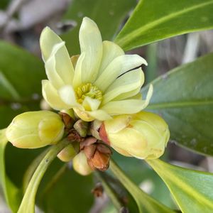 シキミ(樒) マツブサ科シキミ属の常緑小高木 綺麗で可憐なお花を見つけたので調べてみたら… 春にろうのような質感の細長い花びら径2〜3cmの黄白色の花をつける。枝や葉によい香りがあり、昔は樹皮や葉が線香や抹香作りに使われていた。 果実は中華材料の八角に似るが猛毒のため決して食べてはいけません😱 「悪しき実」から「シキミ」という名前になったという説と 四季を通し、鮮やかな緑なので「しきび」から「しきみ」と呼ぶようになった説がある。 植物としては劇物に指定されている⚠️ *参考 「道草さんぽ」by多田多恵子さん