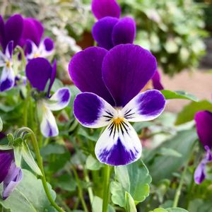 おはようございます😊 駐車場花壇に植えてあるビオラ ブルーラビット🐰 次々に花が咲いてきます💜 花壇が賑やかになりました🤭