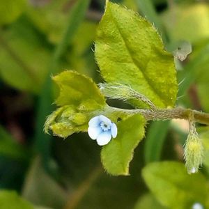 ハナイバナ(葉内花) ムラサキ科ハナイバナ属 キュウリグサに似ているが中心のりん片は黄色ではなくブルー。 葉と葉の間に花がつくのも特徴。 花言葉「小さな親切」