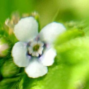 ハナイバナ (葉内花) キュウリグサによく似ているので、間違えやすいです。こちらは白色で発色しません。生育環境も同じで、一緒に生えていることもあります。 キュウリグサの様に花序の先端が渦巻き状にならず、葉と葉の間に花が付くのでこの名前が有ります。 🏷火曜はマクロの発表会