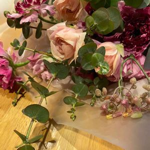 🐸💕息子の結婚式で いただいた花束です。 大きなお花はなんだろう。アネモネっぽいです。 皆様のおかげで、無事式を終えることができました。