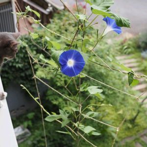 朝顔、今年の第一号が咲きました。2階まで届いてます。