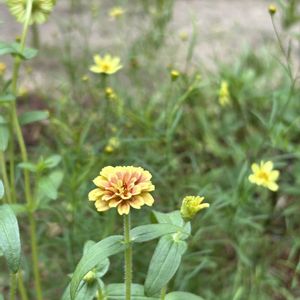 ジニア 2種 ハルシャギクをバックに咲いてる黄色系と 隣のグラスに絡まれてる赤系 どちらも直径2センチ足らずの小ぶりなお花です🤍