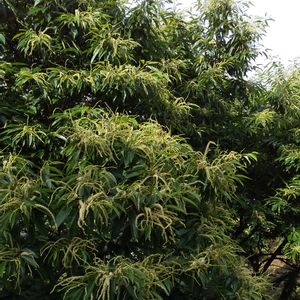 栗🌰の花 葉の間に所々、白く細長いのが栗の花です。 都会では中々見ることが無いでしょうね。 散歩の途中、神社⛩の境内で見付けました。 #刺々 #秋の準備 #いが #栗の花