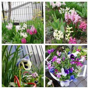 ↖️昨年度6月10日初投稿の写真です。 ↗️今年のヒヤシンスあれから11ヶ月!1ヶ月も早くヒ ヤシスが咲きました。この差😲😲😲 ↙️昨年秋から雪の下で越冬したパンジーちゃん。 ↘️今のビオラ・パンジーの寄せ植えです。 なんでも早くなっても、今日は、雪が降りました。あわてて避難。 びっくりポンでした。予報に無かったので、参りました。😰😰😰