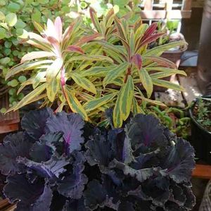 ユーフォルビアと黒葉牡丹😄 今日は天気も良く暖かいので植物の手入れを朝からやってます🎶