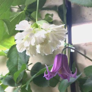 こんにちは😊 クレマチス連投です😆 白いフェンスにクレマチスと薔薇のコラボを夢見た第一歩😆✊💨 トレリスが間に合わなくてテグスで誘引した😅クレマチス ロウグチ(右下)とクリオネが咲き始めました🥰 この子達は冬に見切りちゃんでお迎えしました😊ラベルも無く見たことも無かったのでどんな花姿かなぁとワクワク💕 どちらも壺型でロウグチの方が濃い紫で少しだけ大きめ?です。クリオネはピンクに近い色でとっても可愛いです🥰