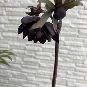 小輪ブラックダブル。 アトロルーベンス交配だそうです。 スッと伸びたステムに小さな鈴がぶらさがっているような花姿が可愛い。 チリンと鳴りそうです。 原種を感じさせる葉の切れ込みもカッコいい⭐️