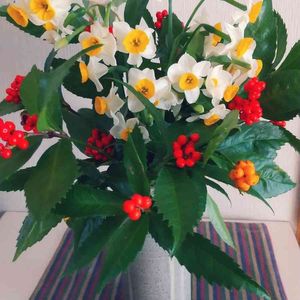 おはようございます😉 この時間になっても晴れ間が少ない今日は 寒さが身に凍みます😥 すでにお正月気分は抜けていますが💦 大晦日にうちに咲いていた ☘️水仙☘️と…きのうのお花☘️千両☘️を 慌てて生けました🤭 千両はうちの植木場のあちこちに 増えてきていますが…赤い実が鮮やかで 冬の植木場に彩りを添えてくれます☺️ 黄色い千両も少しずつ増えていますよ~😊