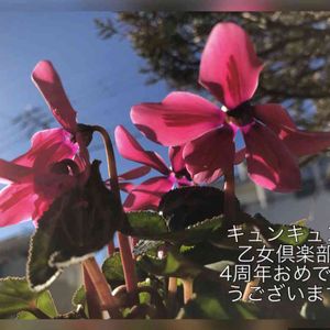 こんにちは*ˊᵕˋ)੭ ㊗️キュンキュン乙女倶楽部4周年おめでとうございます😊 これからも皆さんの素敵なpic楽しみにしています🤗♬ もんもんチャンこれからもよろしくお願いします。 今日も寒いですが、青空いい天気☀️ ホームセンターで売れ残っていたシクラメンが、とっても可愛く咲いてます。