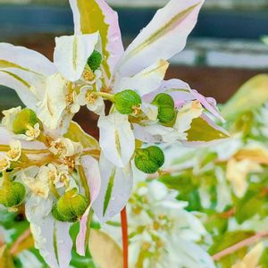 おはようございます😃 🏷️白い水曜日♡に参加させて下さい🙏 雨上がりにご近所散歩してハツユキソウ見つけました。 葉っぱの白と緑のコントラストが薄れ、少し紅葉していました。 緑の果実も出来ていました🫒