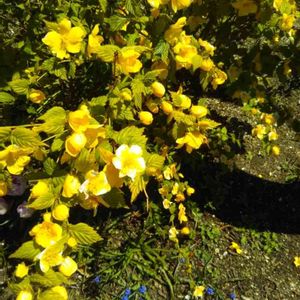 ご近所散歩① ヤマブキ 黄色い花や蕾ですが、 真ん中辺りの花は白色も交ざっていたように見えました。 ヤマブキでもシロヤマブキなどの種類が有ると聞きました。