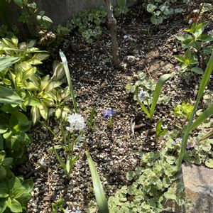 小さな花壇がモリモリに💜💙🩵🤍🩷 ③ミニバラは植えっぱなしでもう何年も🌹 ④アジュガは増えすぎて全部撤去したはずなのに🪻 ⑤妖精さん🧚♂プスキニア🩵🩵 これで最後かな