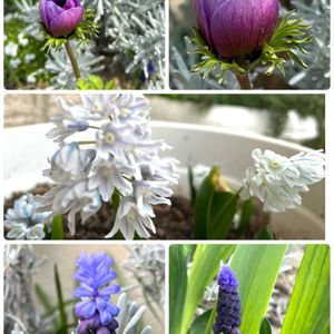 こんばんは🌃 ①ムスカリ ②③ヒヤシンス 昨年水耕栽培後、鉢植えしました🎵 ④ハナニラ 庭のあちこちで咲きだしました🎵 ⑤プスキニア 寄せ植えの中で、可愛く咲いています💕