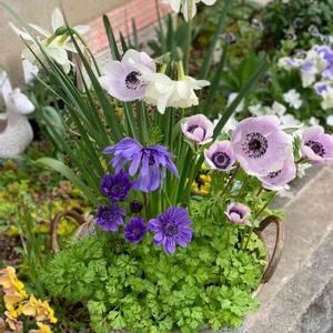 植えっぱなし球根を集めた鉢 アネモネ、スイセンの他、この角度だと隠れてますが、プスキニアもあります。 スイセンは、色も形も気に入っているタリア。 スミマセン、picが重複してるように見えたので、片方消したつもりが両方消えました。 コメントいただいていたのにお返事ができず…。