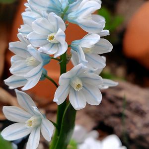 プスキニア *リバノチカ* pic②咲き始め 「植える鉢と深さ間違えたな...」と思ったけど 咲き進んだらちゃんと縁から顔を出してくれました 薄青の1本筋から別名ストライプド・シラーとも シラーよりは大きく、ヒヤシンスよりは小さい 早春にぴったりの可憐なお花です⚘⡱