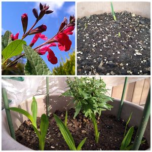 こんにちは😊 雨が降りそうで雲が重く降りてきました😊 7個植えたニンニク6個出ました🧄 フリージアは初めてのトライでなぜか順調です💜🤍🧡チェリーセージは挿し木です💗