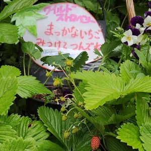 花壇のワイルドストロベリーが赤くなってきたので、お知らせの看板を出しました🍓🐰💕