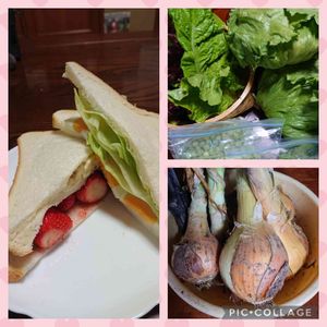 レタス🥬/サニーレタス/玉ねぎ🧅収穫してきました☺️ 最初サラダだけで、食べてた主人…サンドイッチに目覚めました😁 いちごは、無人で買ってきた100円いちごを使って‼️ 結婚して、何十年!2回目の手料理です😆🎵🎵 美味しく頂きました 🍴🙏