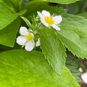 おはようございます♪ クリスマスローズの葉の間からお顔を出してるワイルドストロベリーのお花さん。 大きな葉の下でどんどんランナー飛ばしてます☘️🍓☘️ 今日も良い一日を🤗🍀