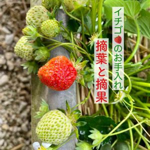 🍓摘葉 常に4〜5枚の葉で育てる。 適温下で葉が4枚の時、花つき・実つきがよくなる。 日があたりやすいので、つややかできれいな実が収穫できる。 🍓摘果 イチゴの花は何段かに枝分かれしながら、房状に花がつく。 1花房に10〜12果できるが、小さな実は摘果して7〜10果にする。 息子のイチゴなので、手伝ってもらいます😊初なりイチゴは息子が美味しそうに食べていました😋