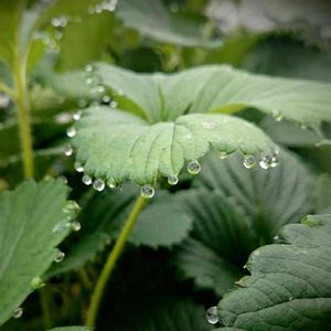 朝露のイチゴ、もう一枚。 葉やガクの先から滲み出た水滴がキラキラ✨