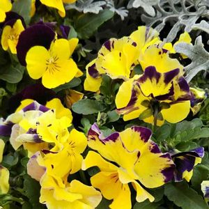 某施設ボランティア花壇の よく咲くすみれ・スイートポテト🌼 黄色と紫色のコンビが綺麗なバンジーなんだけど これは変異? 優しく混ざりあってる。 初めて見つけたので 記念に📸